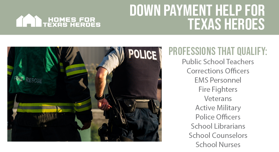 Homes for Texas Heroes Program offers home loans and down payment assistance for teachers, first responders, corrections officers, and veterans.